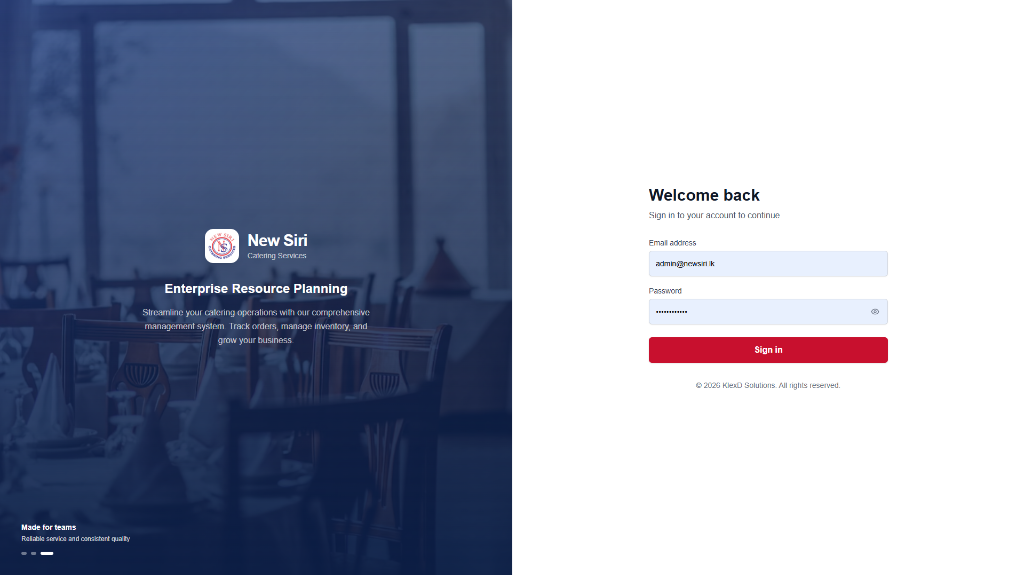 A custom-built Enterprise Resource Planning (ERP) platform designed exclusively for NewSiri Caterers. This comprehensive system centralizes their daily operations, featuring advanced modules for real-time inventory tracking, dynamic order pipeline management and intelligent staff scheduling.